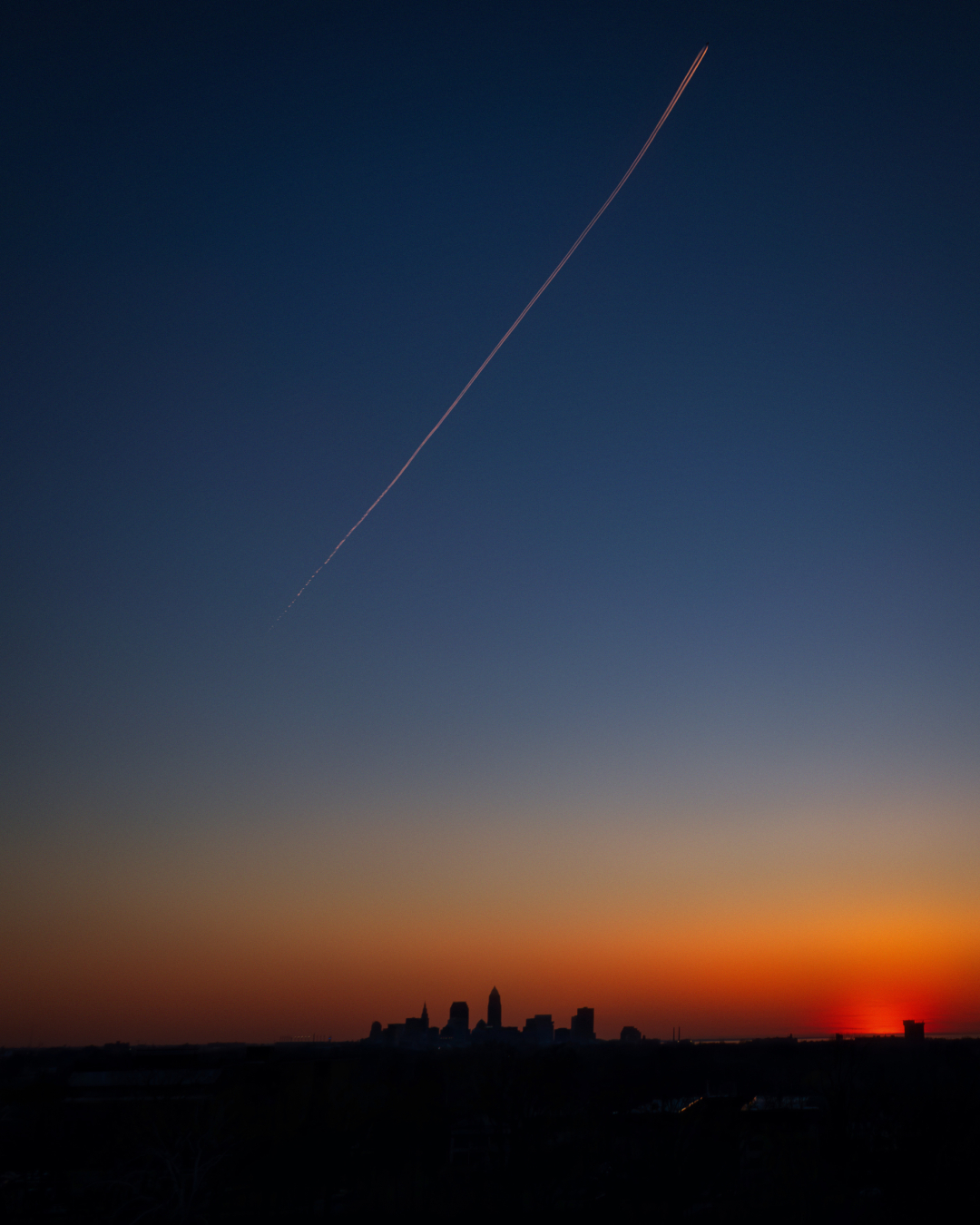 Cloudless sunsets are beautiful in their own way, but pale in comparison to the way the sunset hits off the cloud cover, especially after a storm. So when I set up for this shot, I was a bit disappointed. That is until I noticed the planes leaving trails in the sky. Somehow I managed to snap a long exposure just as this plane ascended directly above the city. Ready for lift off here in Cleveland!